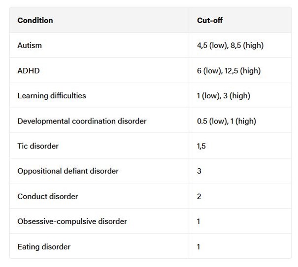 Different conditions have different cut-offs. The table below shows that autism, ADHD, learning difficulties and developmental coordination disorder have both a high and a low cut-off, depending on which level of sensitivity and specificity one wishes to apply. Note that these are based on the gate questions (see above), where each question is scored as 0 for “No”, 0.5 for “Yes, to some extent” and 1 for “Yes”. The cut-offs only serve as indications but can provide an overview of the individual’s constellations of problems.